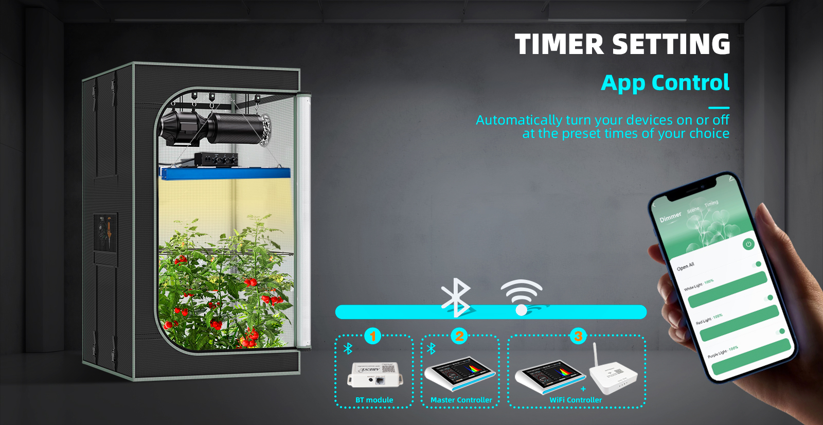 - Featuring Knob-Based Dimming for tactile control and Smart APP Controller storing varies presets for crops like cannabis, tomatoes, and lettuce.