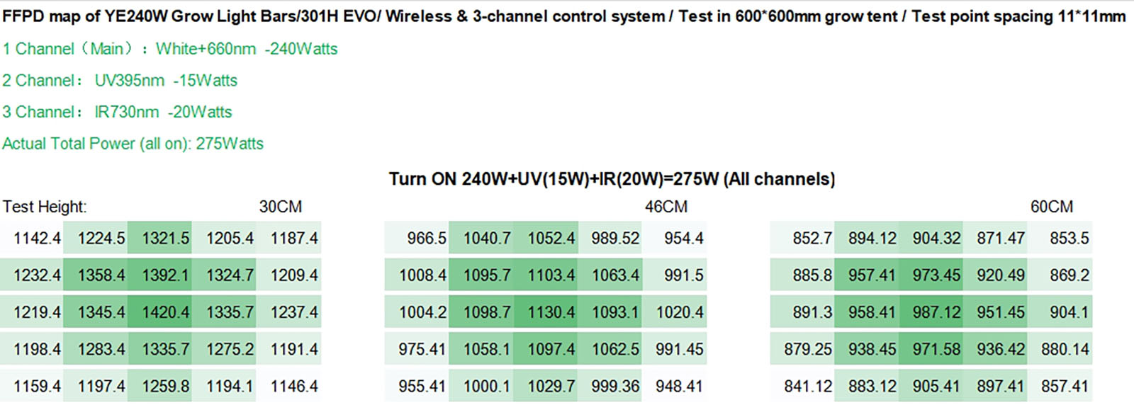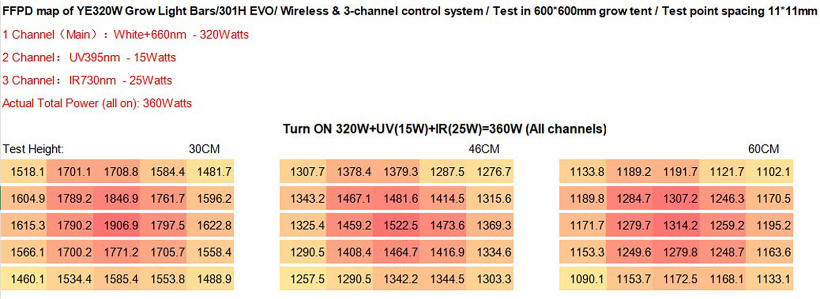 PPFD MAP of YE 320W 240W Grow Light Bars, 301H EVO mix 660+730+395nm, Wireless & 3-Channel control system, Tested in the