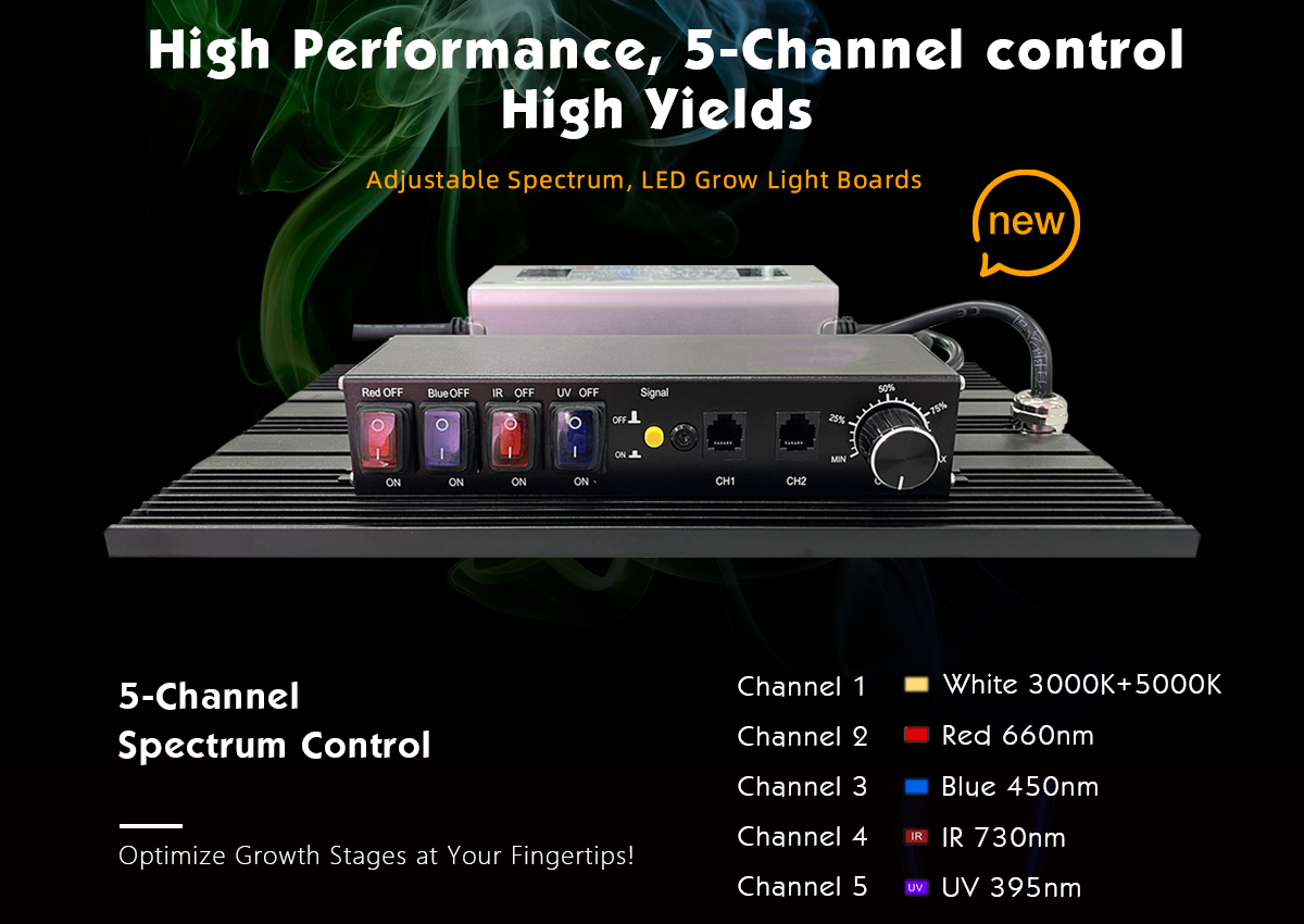 Its optimized configuration ensures even light distribution across your plants. Featuring a full spectrum of Samsung white light (LM301H EVO) , deep red 660nm (R), infrared 730nm (IR), ultraviolet 395nm (UV), and blue 450nm (Bl), it's perfectly suited for all stages of plant growth. Separate ON/OFF switches allow independent control of the 660nm, 730nm, 395nm, and 450nm channels, providing flexibility to meet the varying needs of plants throughout their growth cycle.