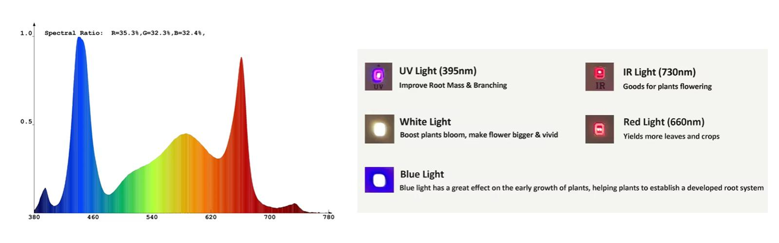 3000K & 5000K(2:1)+660nm+730nm(IR)+395nm(UV)+450nm(Blue) |